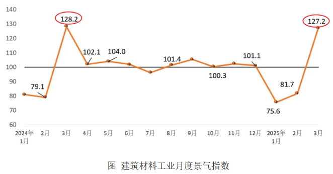 此中,2025年3月份建建材料工业景气指数为127.2点,景气宇取上年根基持平;比1、2月份较着回升,以及下逛建建业、制制业需求市场逐渐启动,隔热保温材料、建建用石、建建卫生陶瓷等4个行业产物价钱环比上涨;3月份建材市场需求总体呈现较好恢复态势,同时,使用建材产物的相关制制业需求恢复速度好于上年同期;